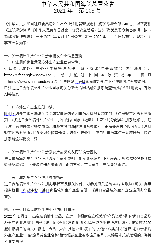 海关总署公告2021年第103号 (关于中华人民共和国进口食品境外生产企业注册管理规定和中华人民共和国进出口食品安全管理办法实施相关事宜的公告)